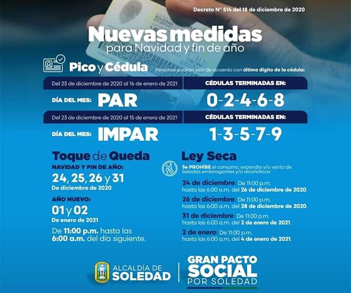 El mandatario de los soledeños explicó que teniendo en cuenta que el municipio es clasificado por el Ministerio de Salud como de alta afectación por el virus y debido al incremento en las cifras de contagiados se aplicará de manera transitoria la medida de toque de queda, ley seca para Navidad y fin de año.