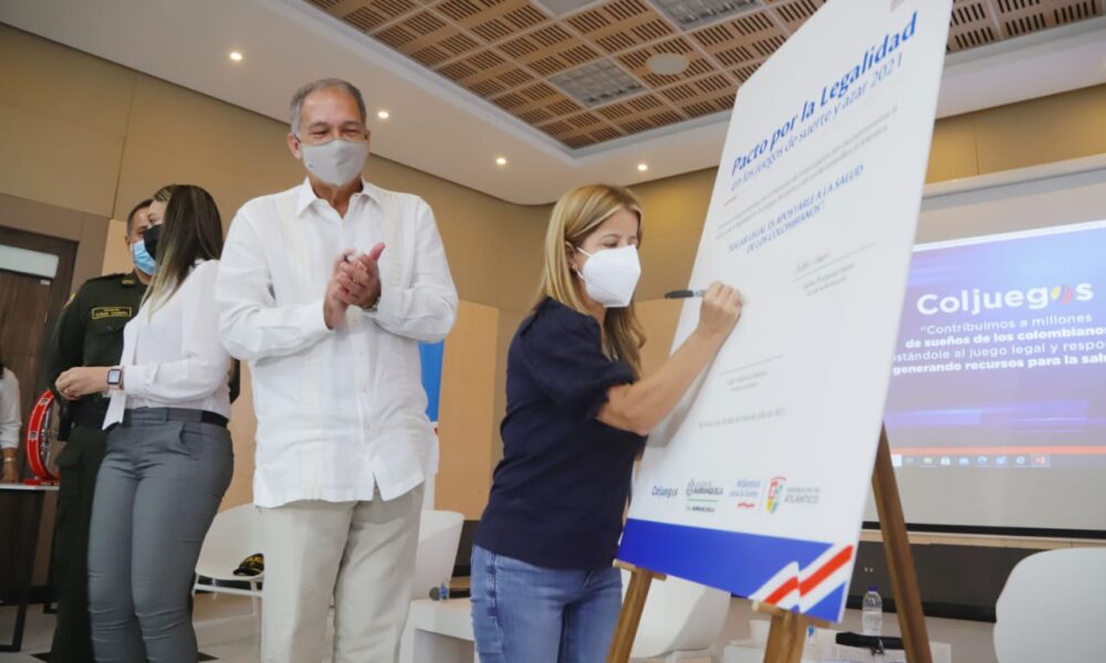 La Gobernadora del Atlántico, Elsa Noguera, junto al presidente de Coljuegos, César Augusto Valencia, y la secretaria de Gobierno de Barranquilla, Jennifer Villarreal, firmaron un pacto por la legalidad en los juegos de suerte y azar que compromete esfuerzos conjuntos del Gobierno Nacional, los entes territoriales y la Policía Nacional en la lucha contra la ilegalidad en la industria de las apuestas.