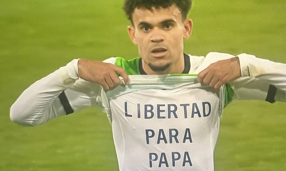 Lucho no celebró como habitualmente lo hace y se limitó a mostrar una camiseta dónde pedía liberación para su padre Luis Manuel Díaz, quién está privado de la libertad desde el pasado sábado 28 de octubre a manos de la guerrilla del ELN.