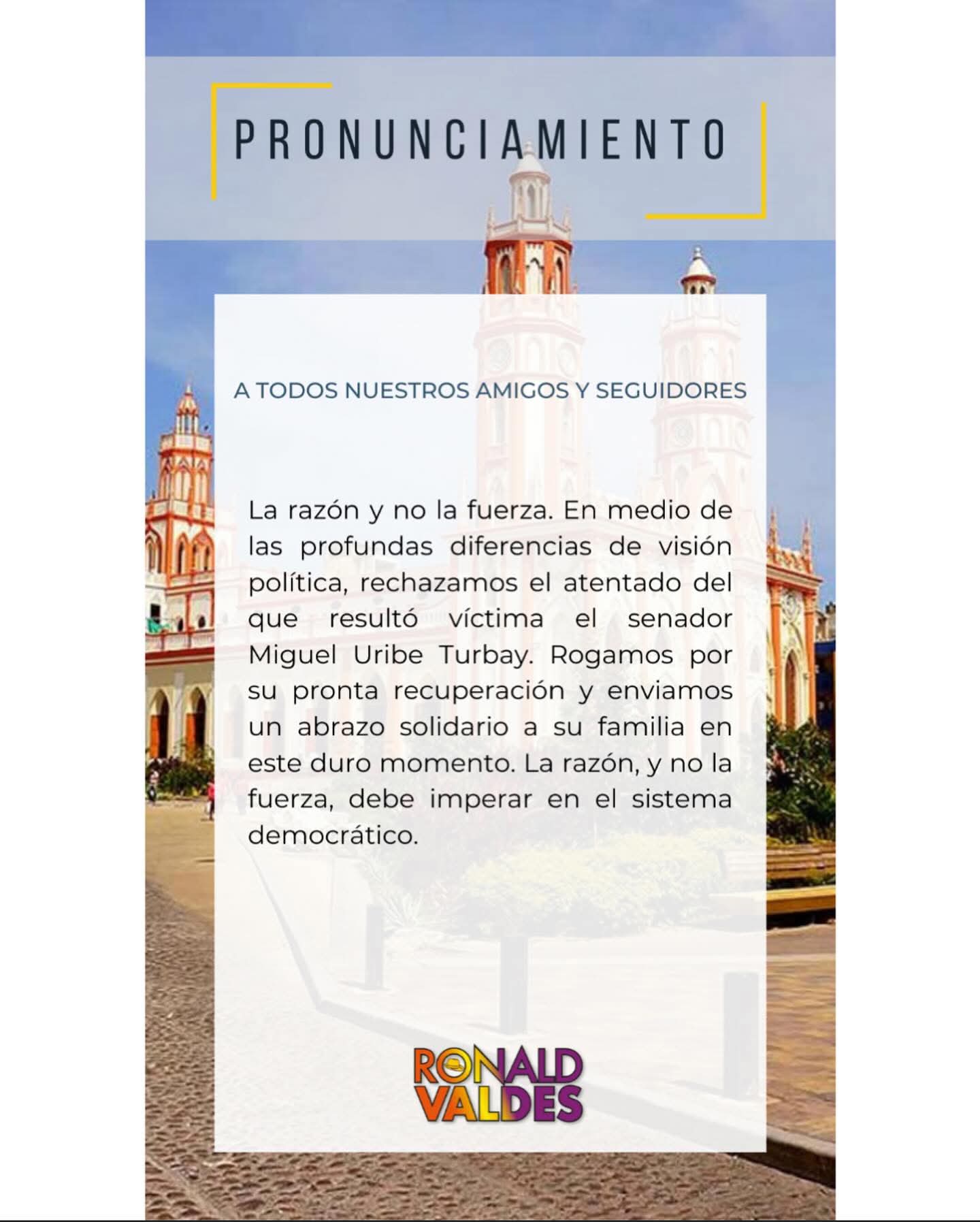 «La razón y no la fuerza. En medio de las profundas diferencias de visión política, rechazamos el atentado del que resultó víctima el senador Miguel Uribe Turbay», dijo Ronald Valdes Padilla, dirigente social.