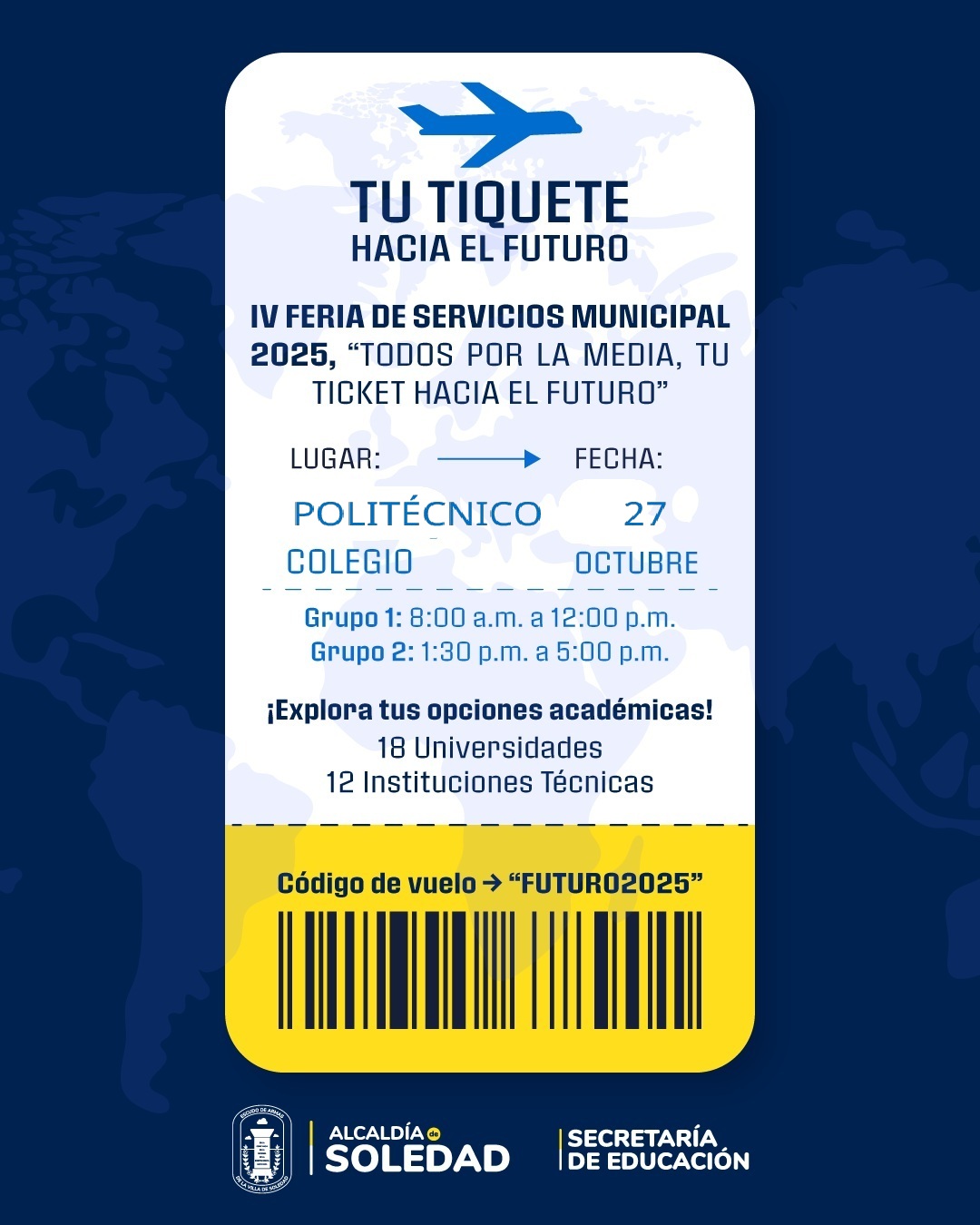 La Alcaldía de Soledad, a través de la Secretaría de Educación, informa a la comunidad educativa que la IV Feria Municipal de Servicios Todos por la Media “Tu tiquete hacia el futuro” cambia su fecha de realización para el 27 de octubre, en la Institución Educativa Politécnico, en el horario de 8:00 a.m. a 5:00 p.m.