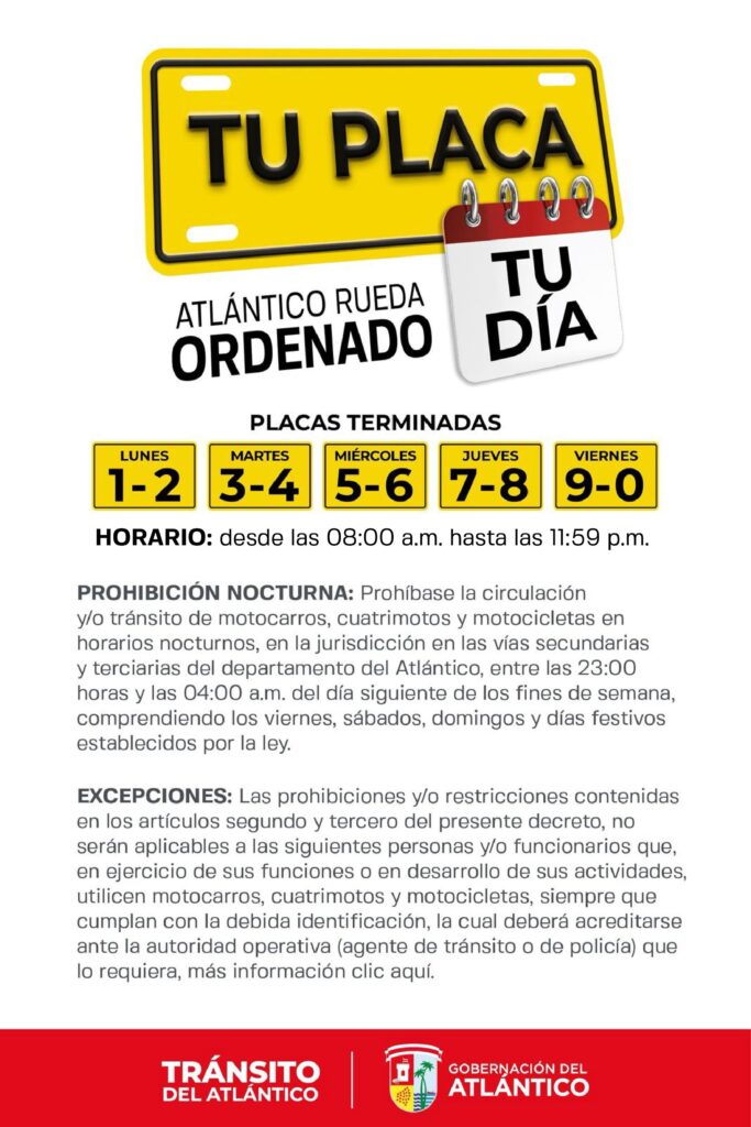 La Gobernación del Atlántico, a través del Instituto de Tránsito del Atlántico, expidió el Decreto No. 000362, mediante el cual se adoptan medidas para implementar el pico y placa de motocarros, cuatrimotos y motocicletas en las vías secundarias y terciarias del departamento del Atlántico.