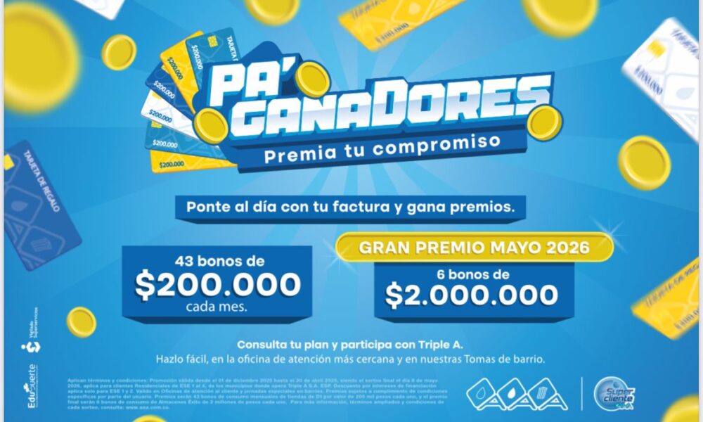 Triple A anunció el lanzamiento de su campaña “Pa’Ganadores – Premia tu compromiso”, una iniciativa dirigida a los usuarios residenciales de estratos 1, 2, 3 y 4 en los 14 municipios donde la empresa presta sus servicios.